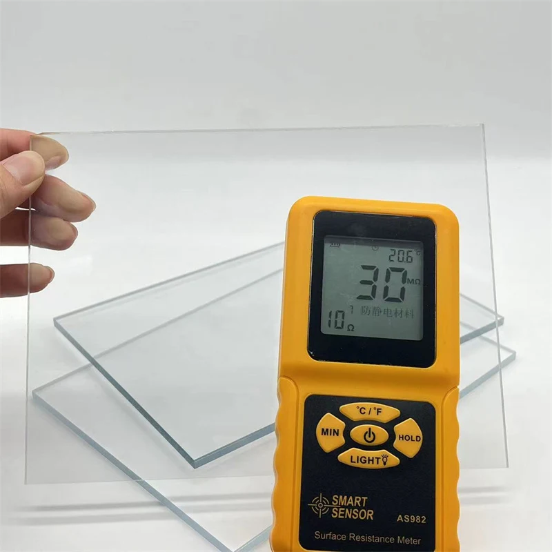Antistatična akrilna plošča ima zelo visoko prosojnost, skoraj enakovredno navadnemu steklu. Zaradi tega je edinstvena prednost v primerih, ko je treba prikazati notranje predmete. Na primer, v aplikacijah, kot so vitrine elektronske opreme in pokrovi laboratorijskih instrumentov, ima lahko vlogo protistatične zaščite in ne bo vplival na opazovanje notranjih predmetov s strani ljudi.